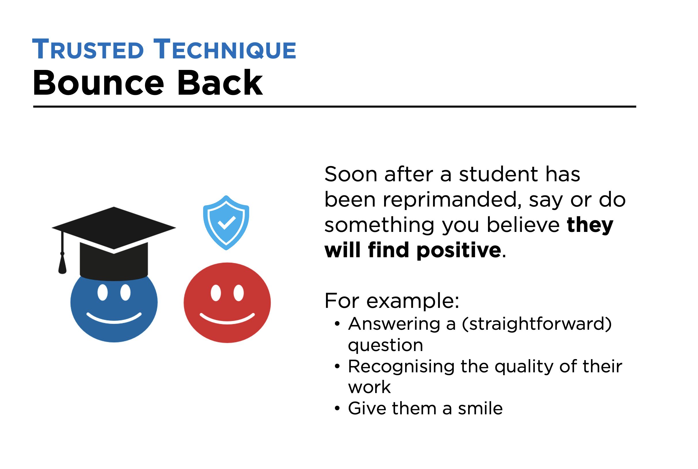 If and when you have used corrections or consequences to address misbehaviour (which are usually perceived negatively), it is important to Bounce Back into positivity as quickly as possible. With regard to any student for whom you have used corrections or consequences, you might do this by: