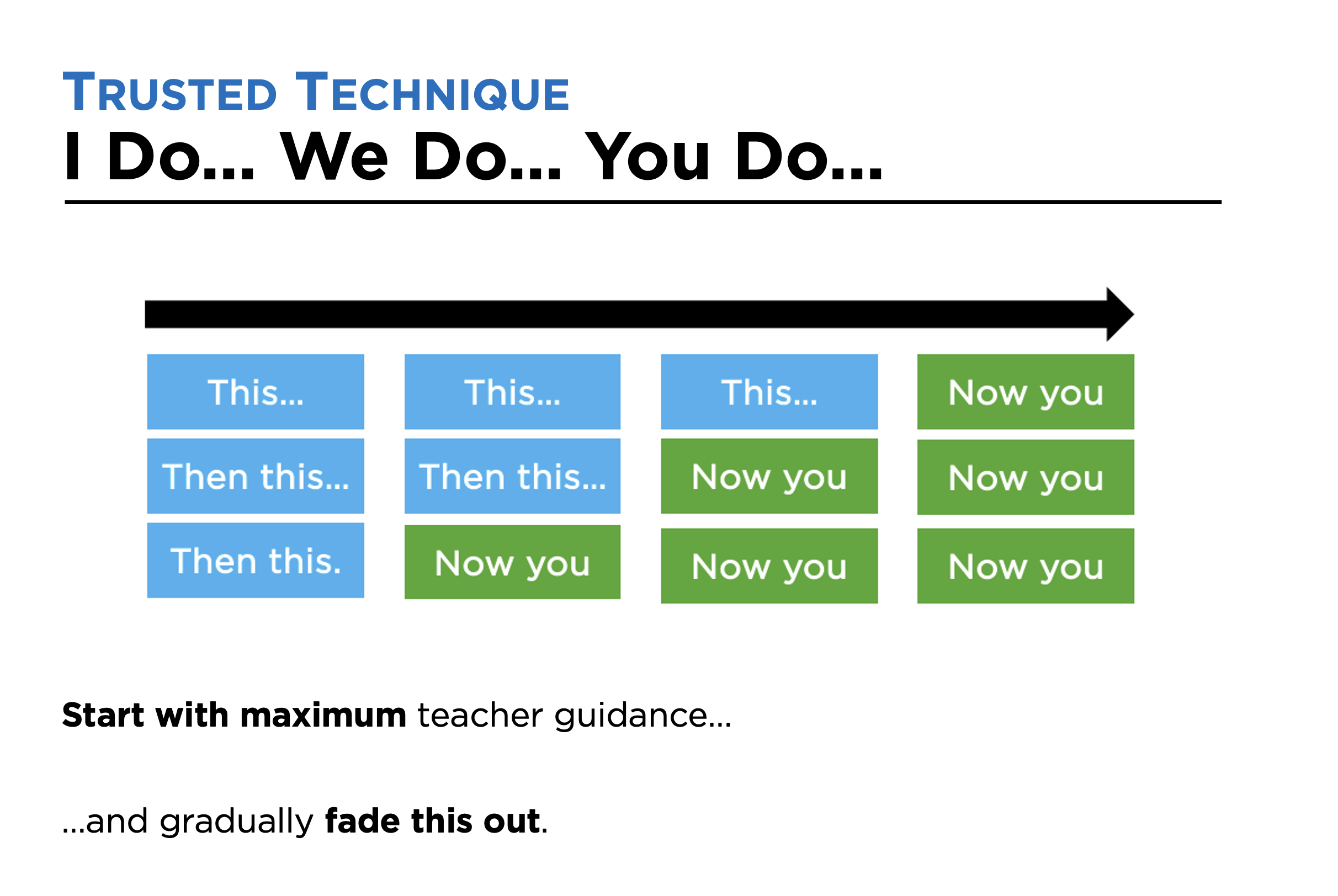 With the technique, I Do… We Do... You Do…, you work through each of the steps of a task to completion, with students watching and listening carefully. Then, you do the same with a similar task, but you don’t complete the last step – students do that, with you monitoring their performance. If necessary, you do some reteaching and repeat this step until you are satisfied enough students can complete the task correctly. Then, you share another similar task but you don’t complete the last two steps – students do that, with you monitoring their performance. Again, if necessary, they do some reteaching and repeat this step until they are satisfied enough students can complete the task correctly. Finally, you give students a similar task to complete wholly by themselves, monitoring how they do.