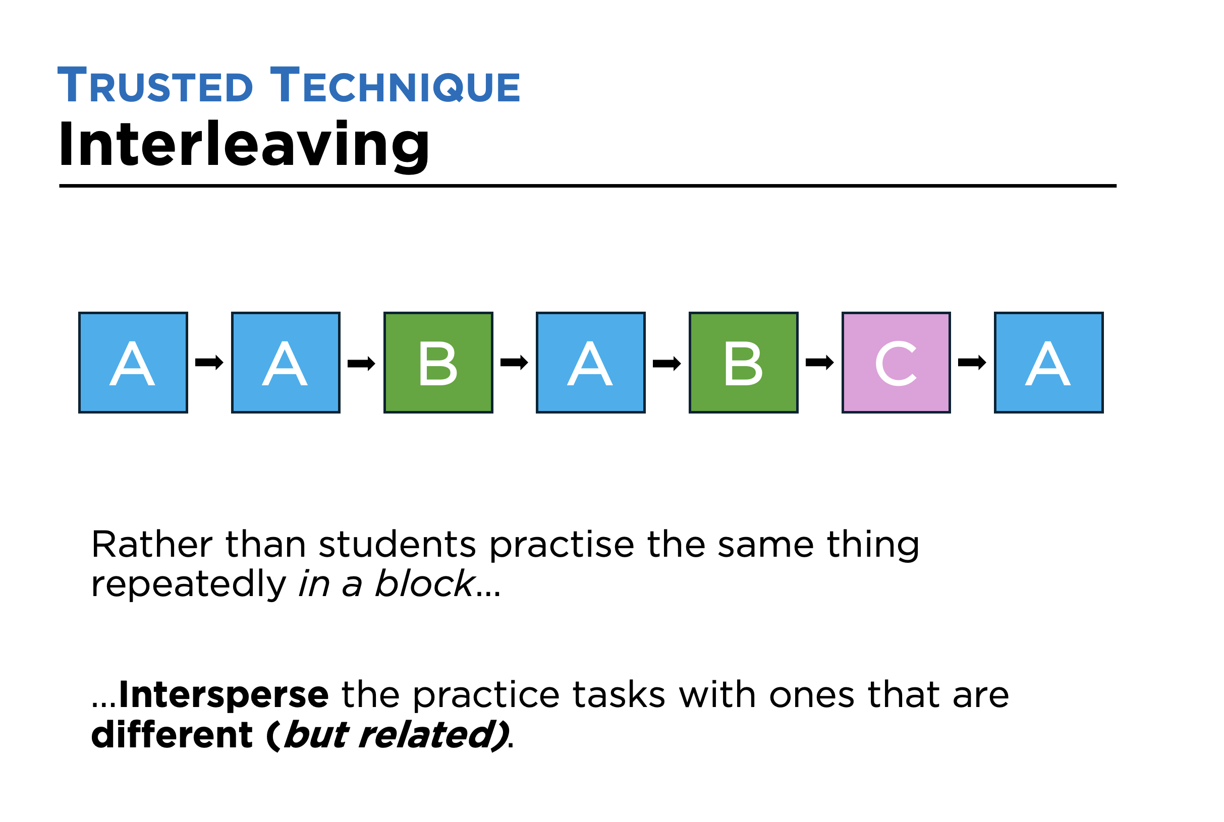 With the technique, Interleaving, you mix up the skills students are practising in a given practice session, rather than have students practise the same skill repeatedly in a block (which is called ‘blocking’). Students practice a specific skill [A], then a different one [B], then might go back to [A] before moving on to [C], then back to [B], etc.