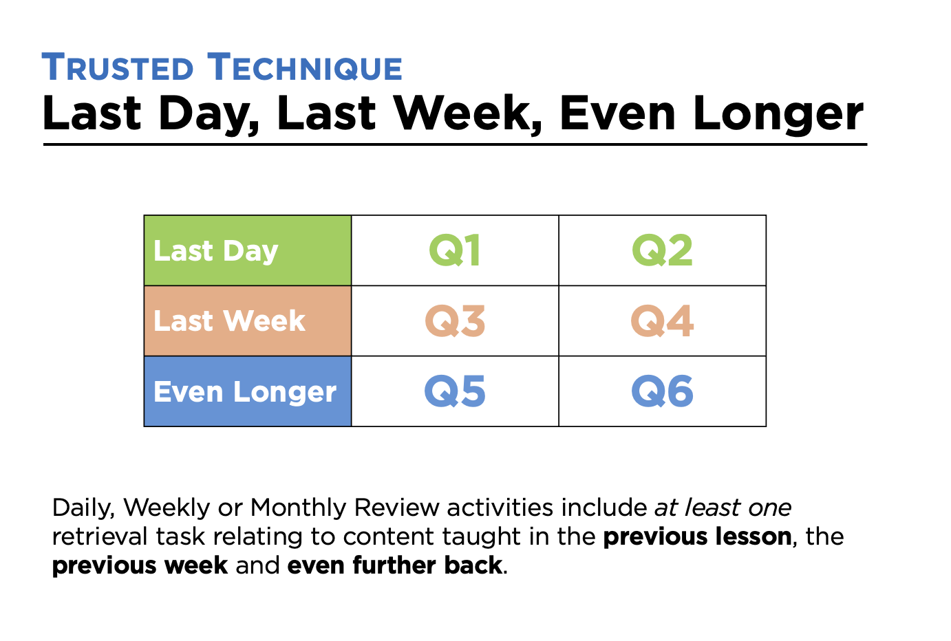 With the technique Last Day, Last Week, Even Longer, retrieval practice activities are used to get students to think about content from the previous lesson, a week ago, and longer ago than this (for example, one or two months ago). The technique can be used in Daily Review, Weekly Review or Monthly Review.