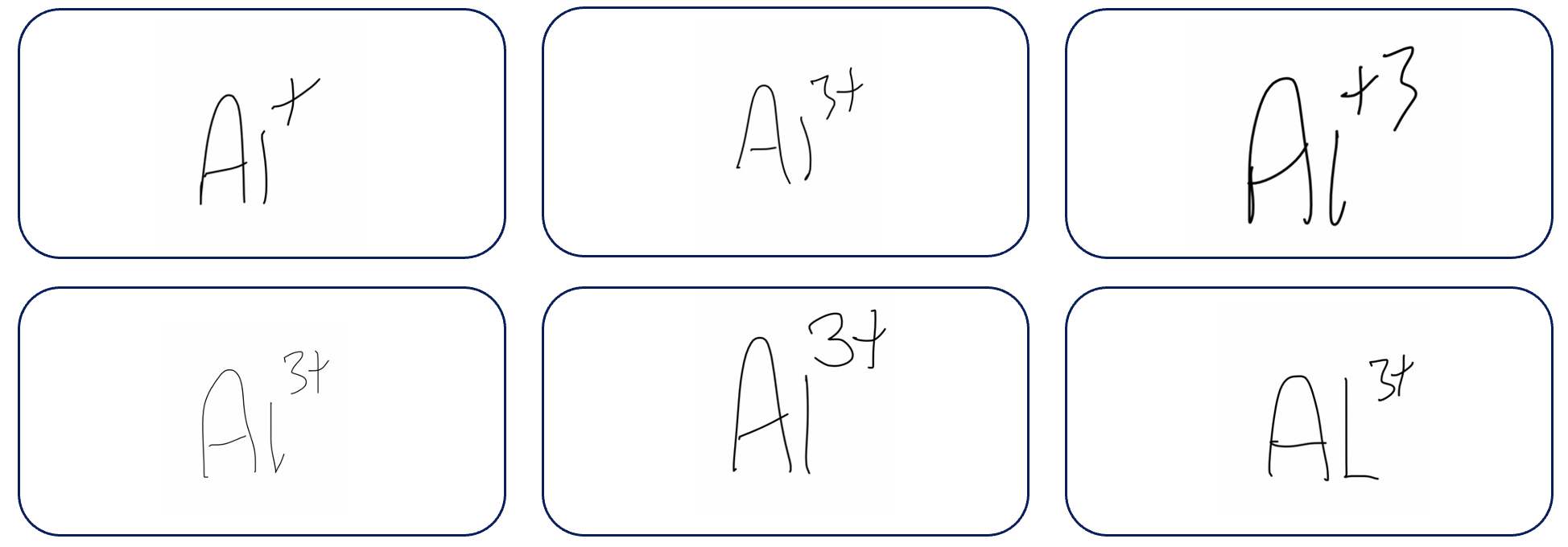 For example, imagine you are teaching students how to write the chemical symbols for ions. You have modelled this, and now you want students to practise the skill. You say: ‘On your show-me boards, write the chemical symbol for an aluminium ion.’ You see the following: