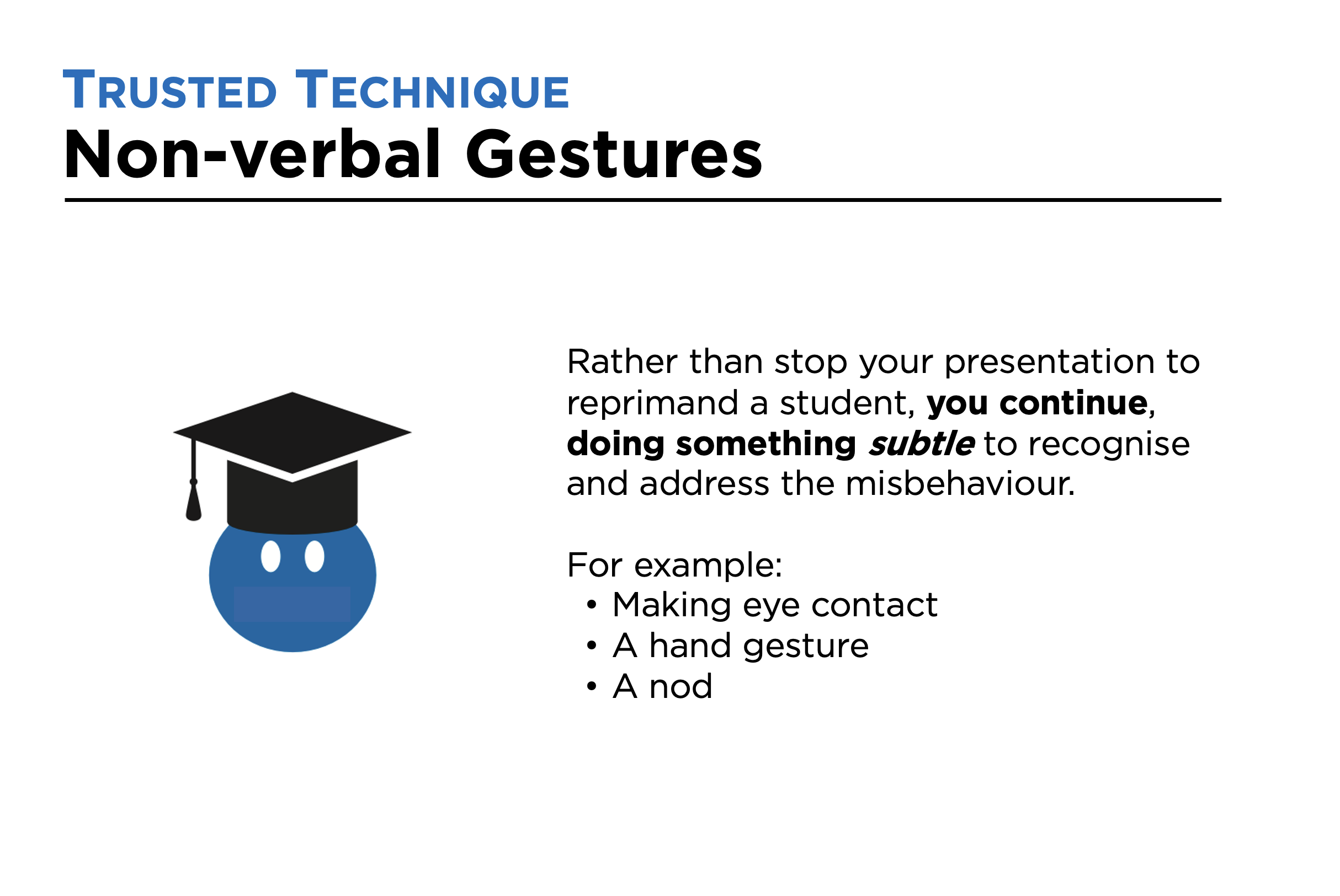 With this technique, rather than stop your presentation to reprimand a student, you continue, using your body language to recognise and address the misbehaviour. For example: