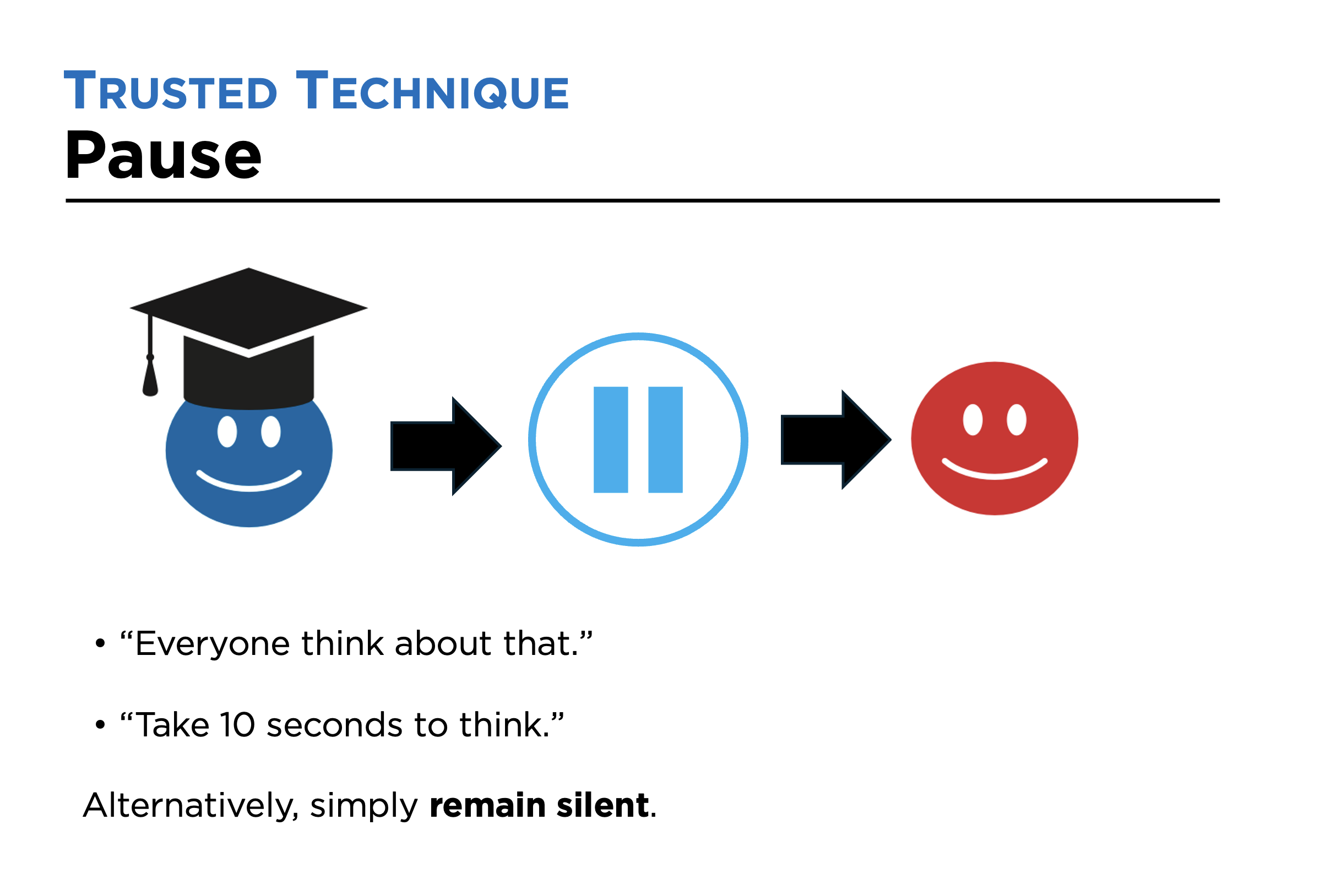 With the questioning technique Pause, you get into the habit of leaving a short period of silence after asking a question. You might do this by using a phrase along the following lines when you ask a question: