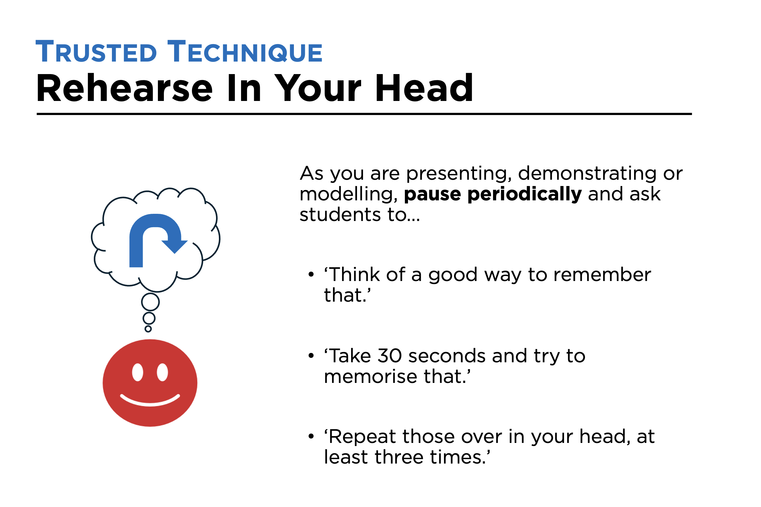With the technique, Rehearse In Your Head, periodically, you pause your presentation and say: ‘Rehearse that in your head’, indicating how long students will be given to do this.