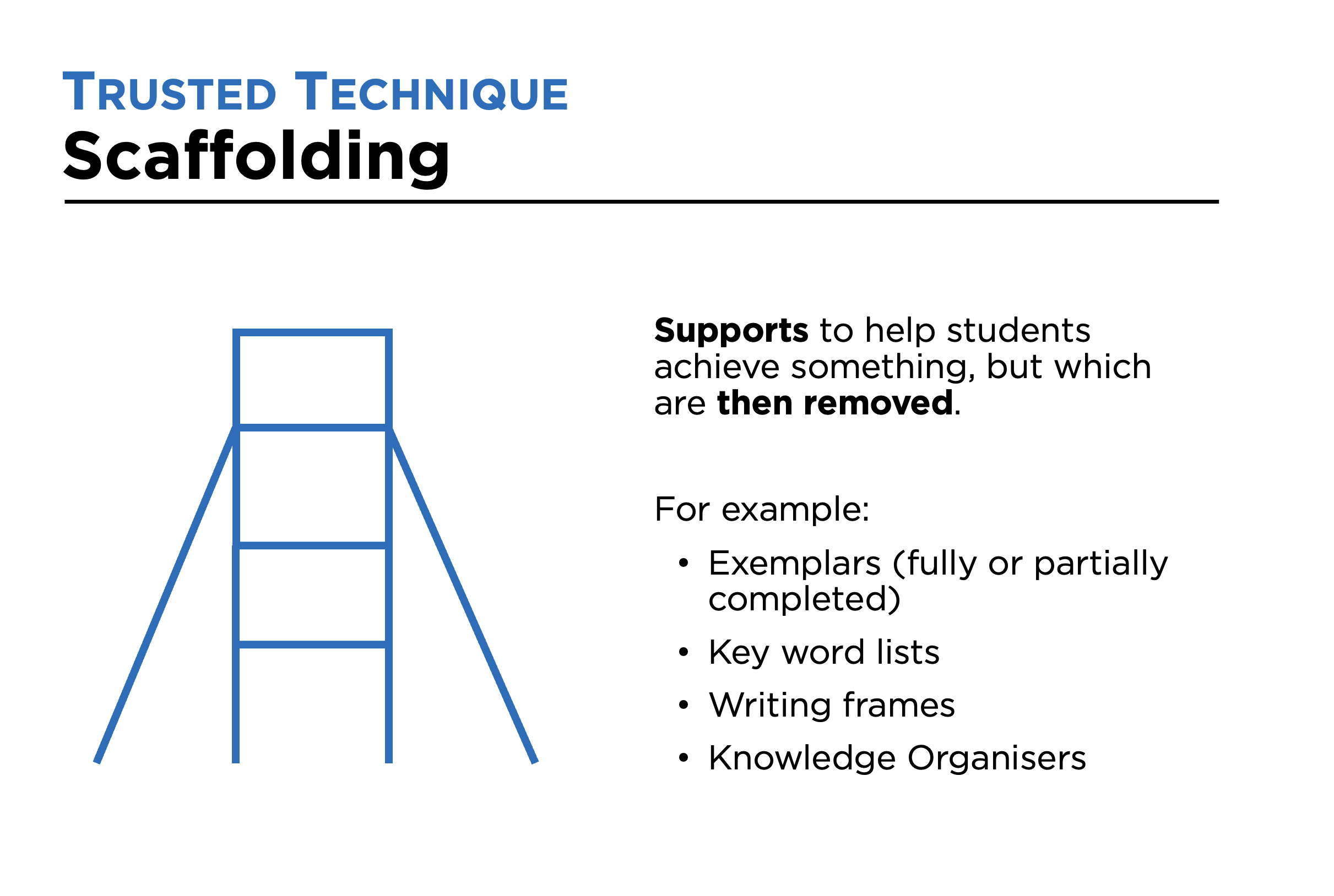 With the technique, Scaffolding, you ensure students have access to supports during practice, but remove these once a level of success has been achieved. Students then practise without the supports.