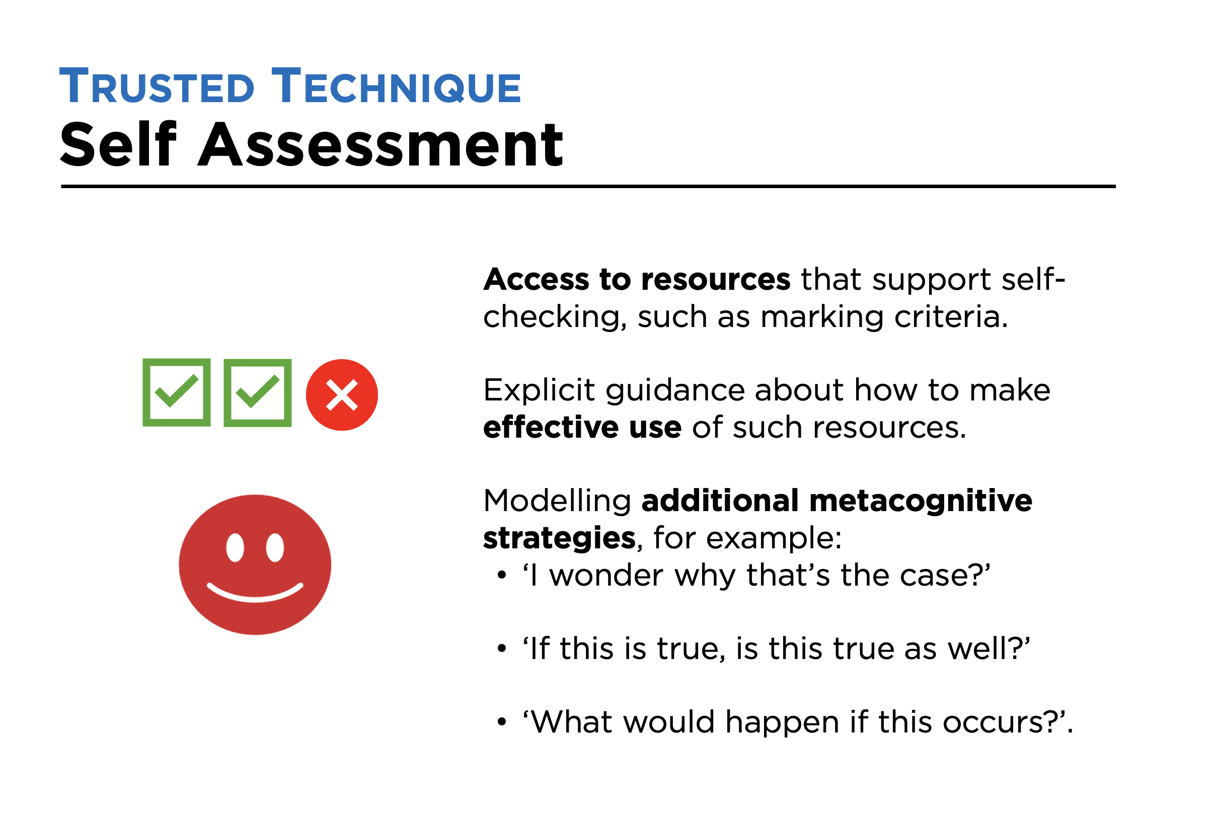 With the technique, Self-Assessment, students check (or ‘assess’) their own performance in a task against clear criteria. Based on this, they make notes or adjustments.