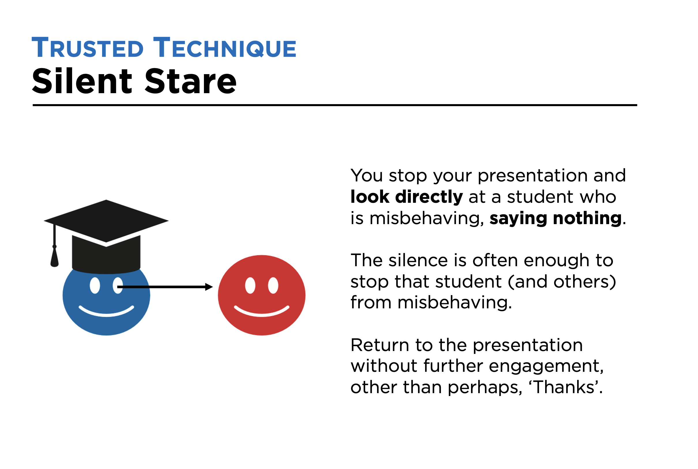 With this technique, rather than reprimand a student for poor behaviour during a presentation, you pause and focus your gaze on the student in question. Assuming the student then stops the misbehaviour, you say ‘Thanks’ and/or smile, to help finish the exchange with a positive.