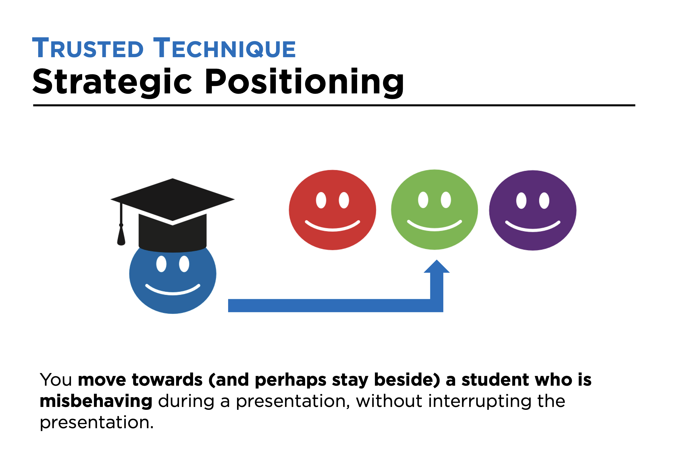 Strategic Positioning helps the student who is misbehaving (and others) appreciate you have clocked the behaviour and would like it to stop. It fits the ‘corrections brief’ of being low-key, positive, directed at a specific individual, and minimally disruptive to the flow of a lesson.
