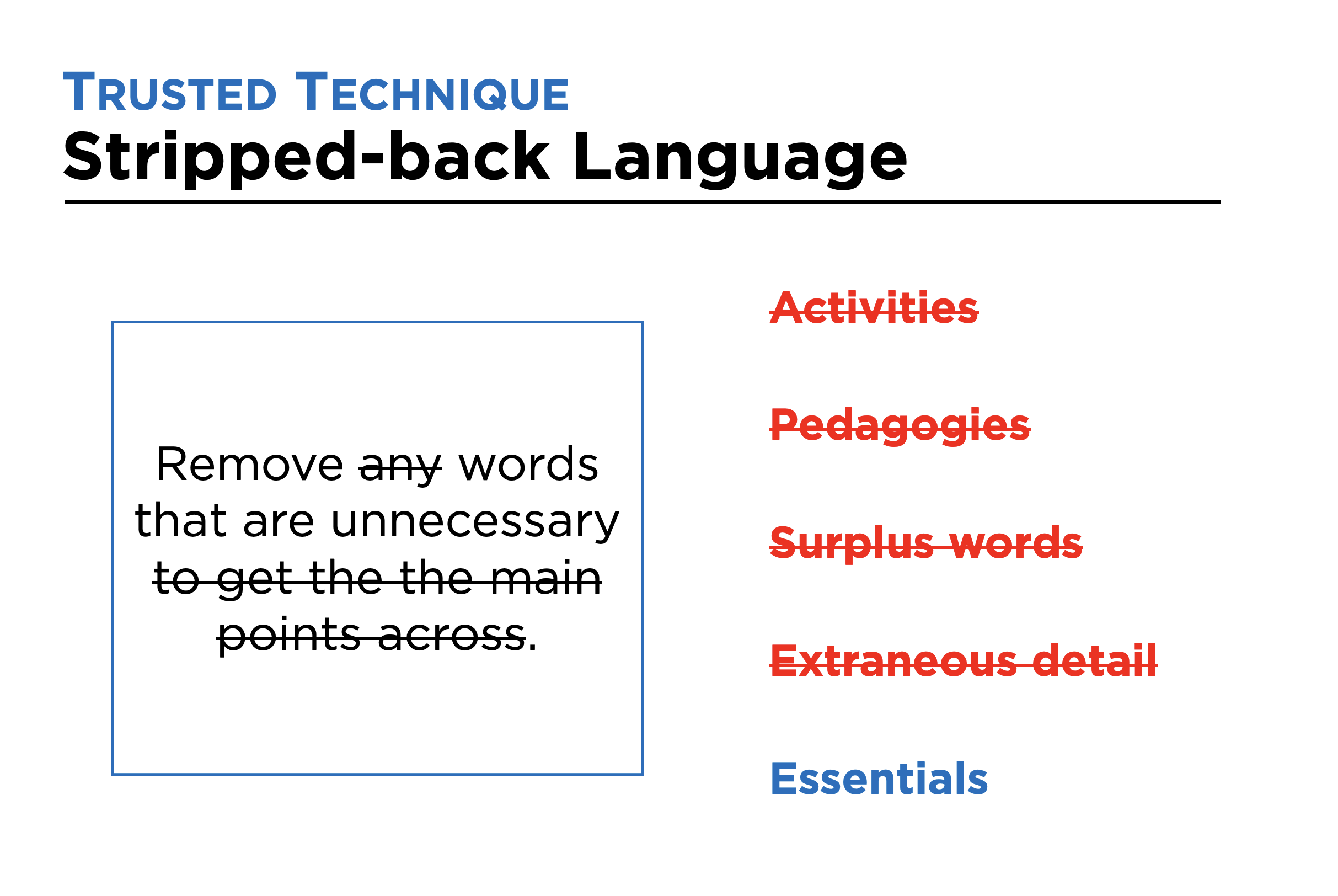 With the technique Stripped-back Language, you make a deliberate effort to keep activities, pedagogies, surplus words and extraneous detail out of the wording of learning intentions, so that the wording is as tightly focused on the learning as possible.