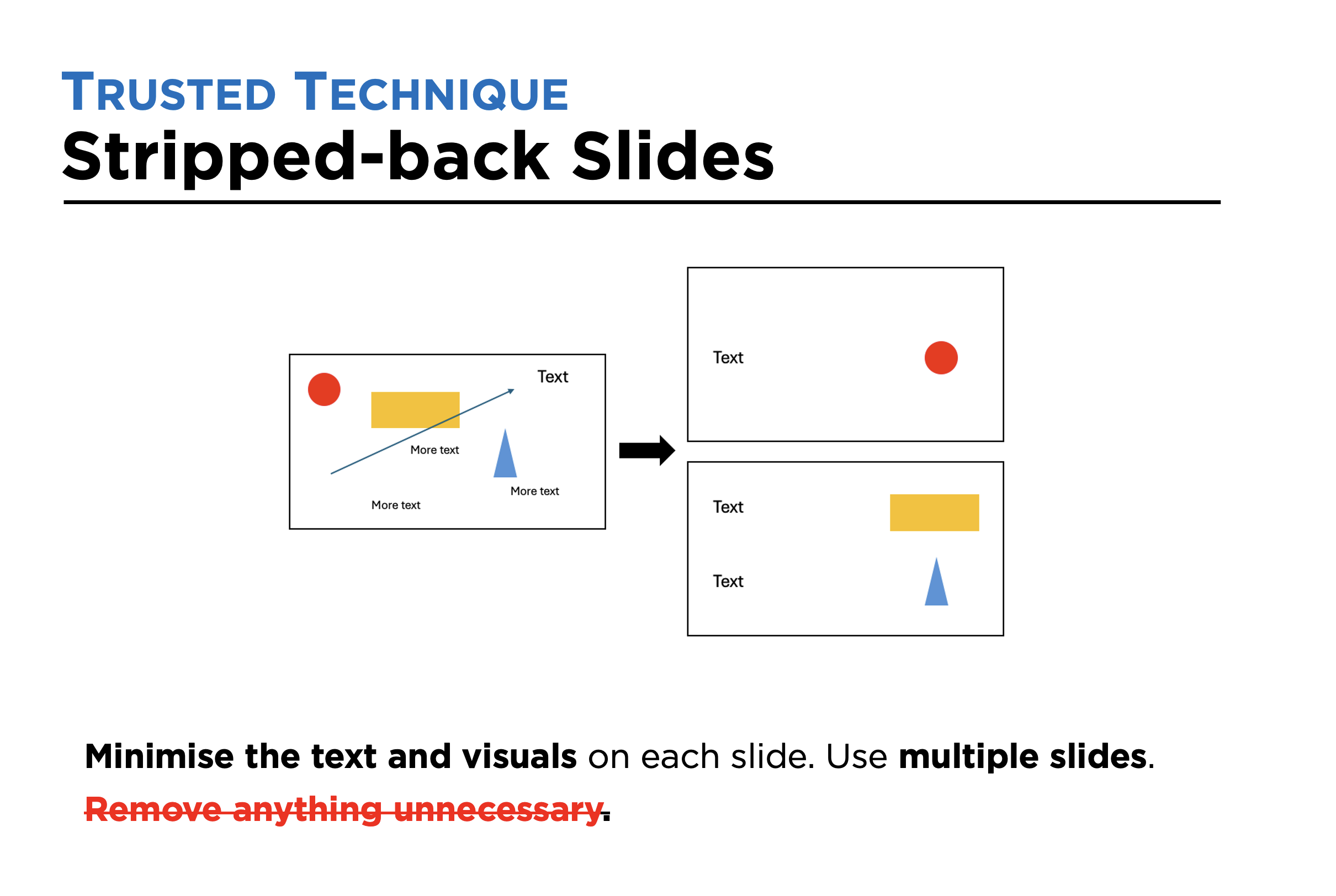 The rationale for Stripped-back Slides is that to help students learn, we need to get information into their working memories so they can think about it. Crammed, cluttered slides aren’t a great way to do that. Beyond this, stripping slides back can help make them more visually appealing, increasing the likelihood that students will be motivated to pay attention to the things we want them to be.