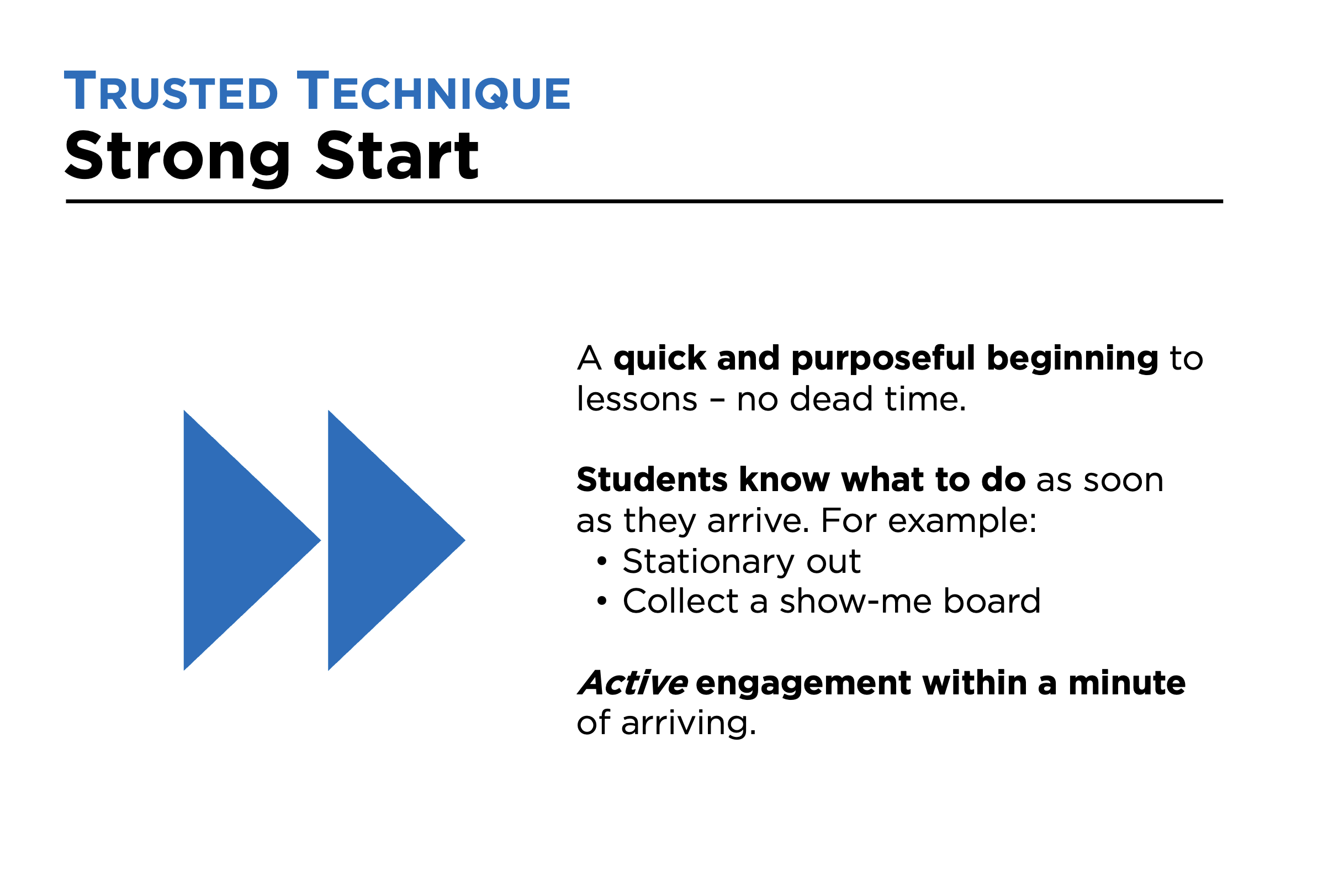 With the technique, Strong Start (Teach Like A Champion – Doug Lemov), you establish routines so every student has their full attention on you are a specific task in the shortest time possible after arriving at class. This might include: