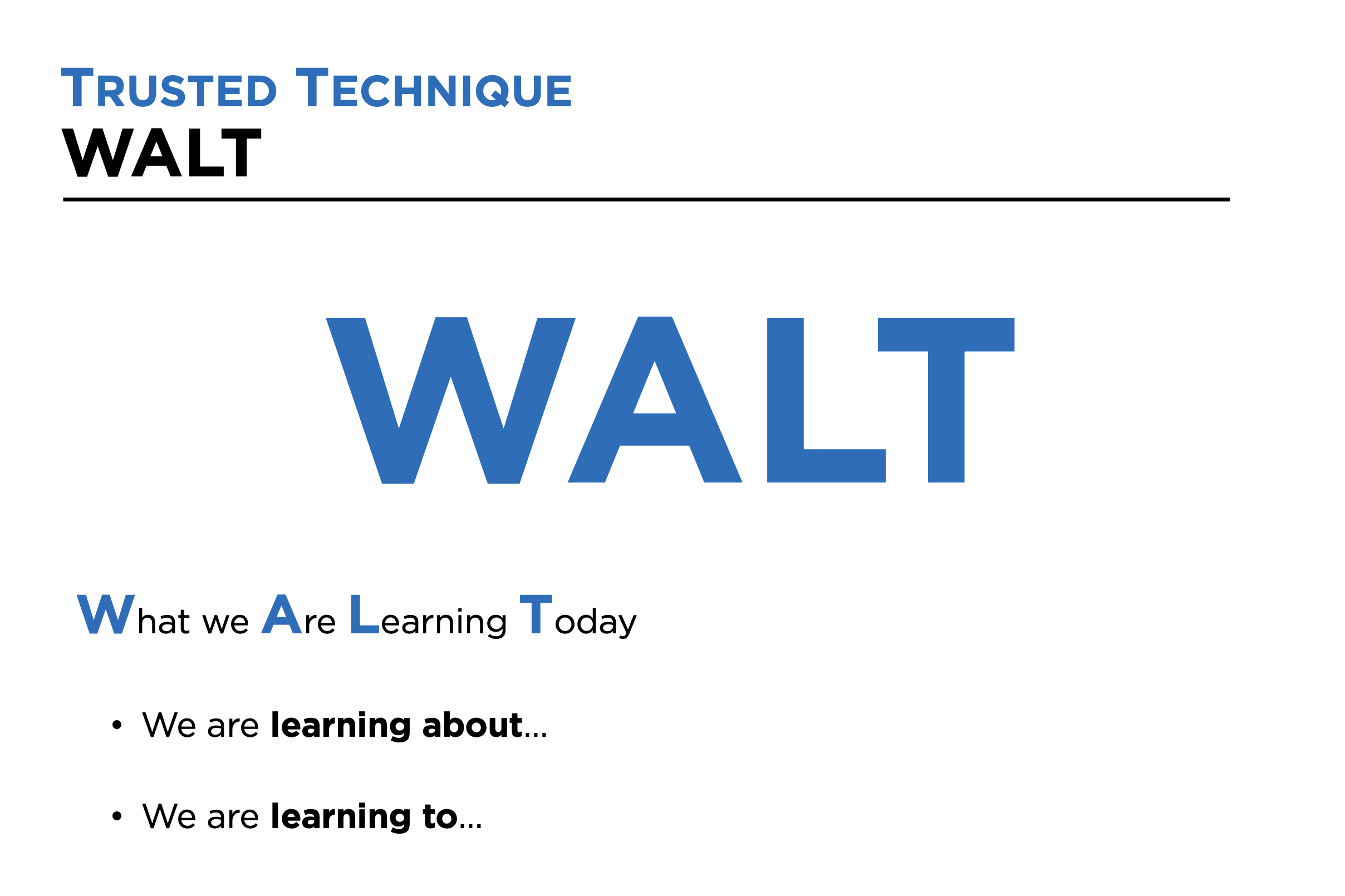 WALT helps keep the focus on learning, as opposed to doing. For example, it helps avoid ‘learning intention’ statements like this: ‘We will be reading chapter three from our textbook and answering all of the questions at the end of this chapter’.
